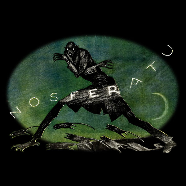 Featuring the iconic silhouette of Max Schreck as Count Orlok, characterized by sharp angles and high-contrast shadows typical of the silent film era.